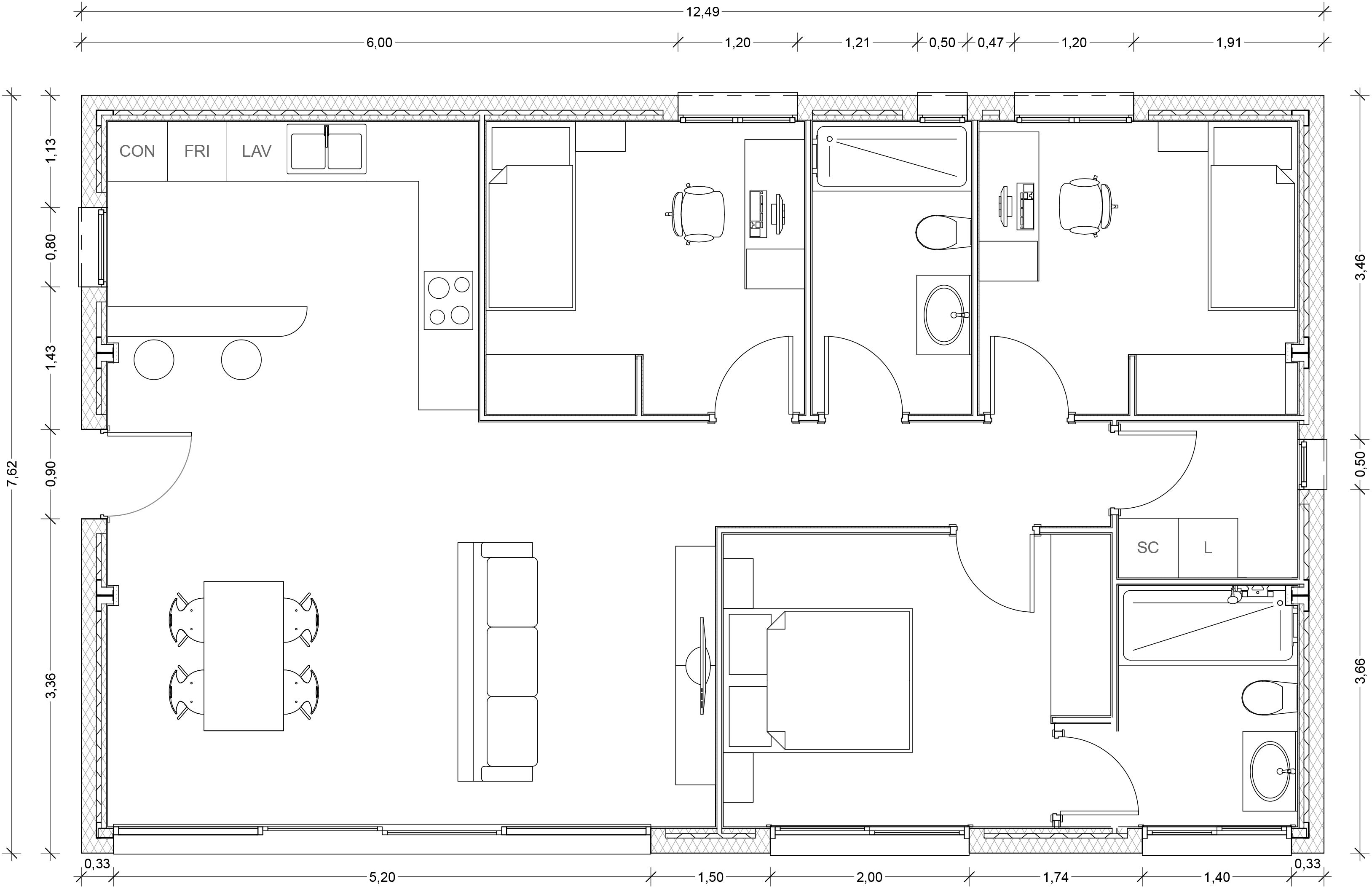 Salón-comedor-cocina, dormitorio doble, 2 dormitorios individuales, 2 baños y lavadero.